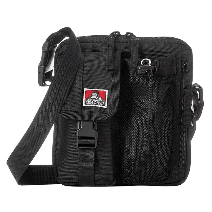תיק צד קומפקטי ושחור של המותג האמריקאי Ben Davis, מושלם לנשיאת פריטים חיוניים יומיומיים. התיק משלב בד עמיד (בסגנון Workwear) וכולל תא ראשי מרוכסן, כיס קדמי נסגר באבזם לבטיחות, וכיס רשת חיצוני עם שרוך משיכה לאחסון מהיר. רצועת הכתף מתכווננת ומחוברת באמצעות אבזם פלסטיק חזק, מה שהופך אותו לאביזר אופנתי בסגנון Streetwear עם דגש על פונקציונליות ואיכות.